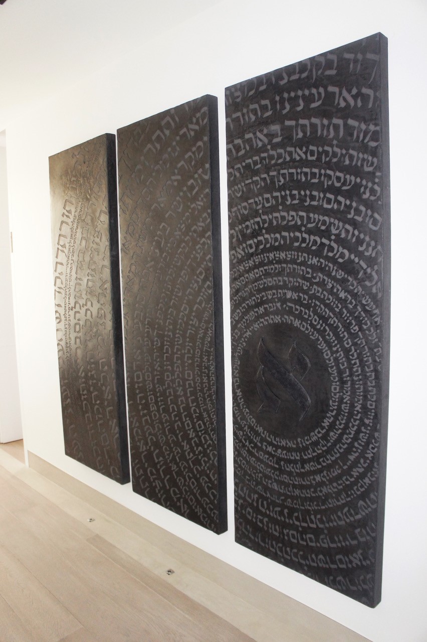 Frank Lalou sees letters on all supports: marquetry, stained glass, jewelry, gardens, models' bodies, ceramics, fabric. The letters in the Kabbalah are at the origin of the world, this is why the artist sees them appear on everything around him.
